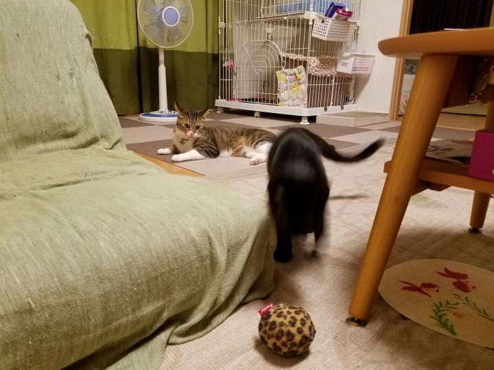 カリタの作業の邪魔なので、その間は大好きなボール遊びで気を紛らせます。