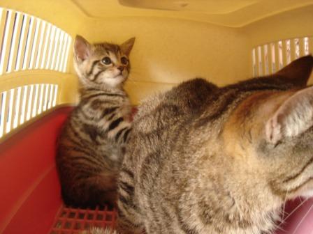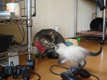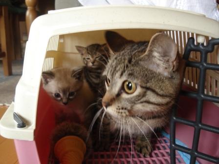 シャムっぽい子とアメショーみたいな子がいます。シャムっぽい子は子猫らしくすぐ探検に出てきましたが(男の子)アメショーみたいな子(女の子)は中々・・・・ママの背中につかまってお外を窺ってます。