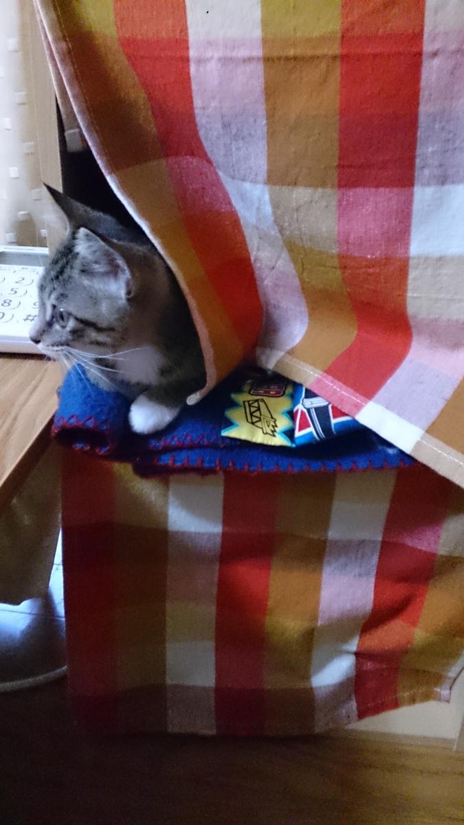 うにさんはカラーボックスの二段目がお気に入り。別なものが収納されてたのですが、取り除いてクッションと毛布詰めたらお気に召した模様。(カーテン付き。)