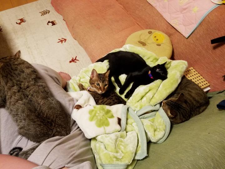 ワタシの膝の上にドラくん、ニコサクポンちゃんは毛布の上に集合です。