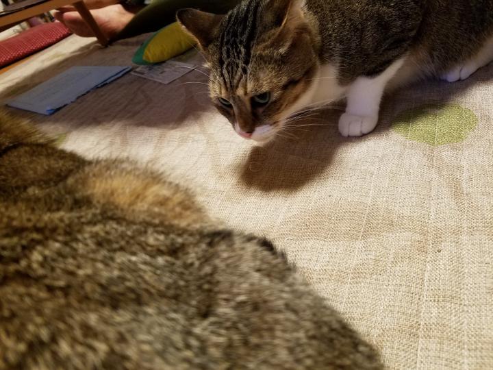 みーちゃんは尻尾も途中で切れてカギ尻尾になってるし、白ちゃんにもものすごい勢いで怒ったことがあるし(体が大きい白ちゃんが逃げた)、けっこうこの辺りでは強い存在・・・らしい・・・😅