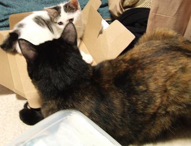 化粧品のサンプルが入ってたダンボールを奪い合い。