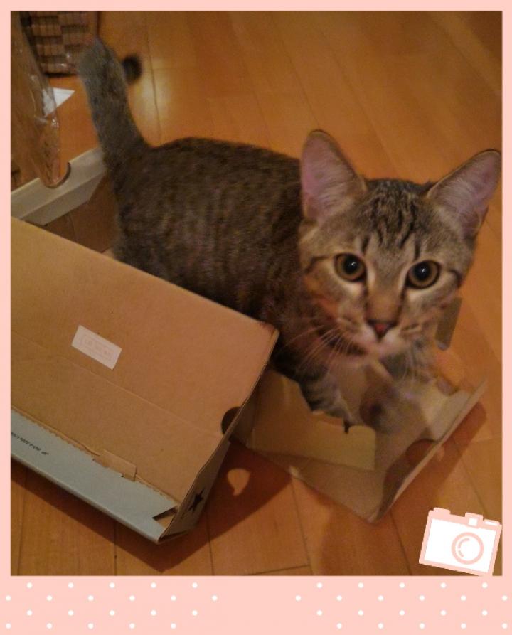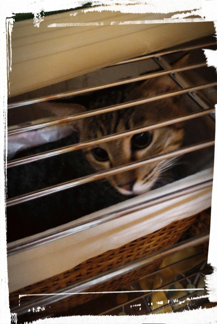そして、急に静かになって、、どこに消えたのかと思いきや、タオル入れの中に潜り込んでました!