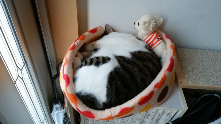 花はいつもここ😺もう小っちゃいね、このベッド、、、😱