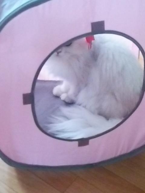 ハウスの2階で寝ていたきーちゃん。ハウスから顔を出したままボーーー(笑)