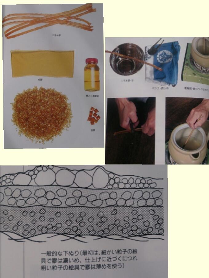 岩絵具の粒の大きさによってニカワの強さ(濃度)を変えたり