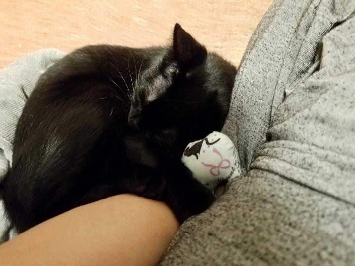 ゆーちゃそさんからいただいたにゃきびしを抱いて、おとさんに寄り添って眠るポンちゃん。