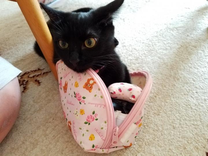 出勤前の忙しい時間でも、遊んでほしくてにゃきびしを持ってくるポンちゃん。