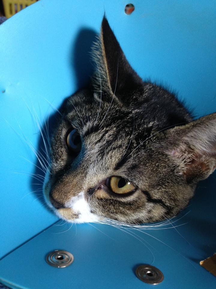 エリザベスカラーを着けたリナに、チビとノアが怖がり逃げていました。