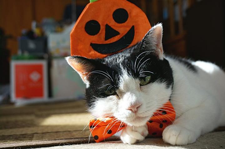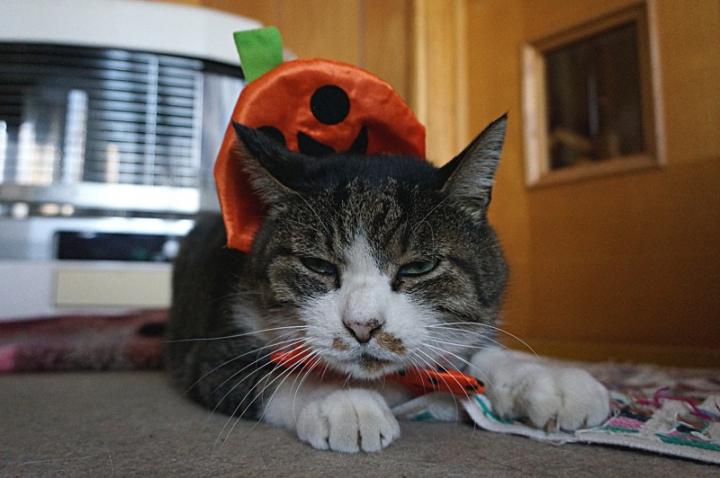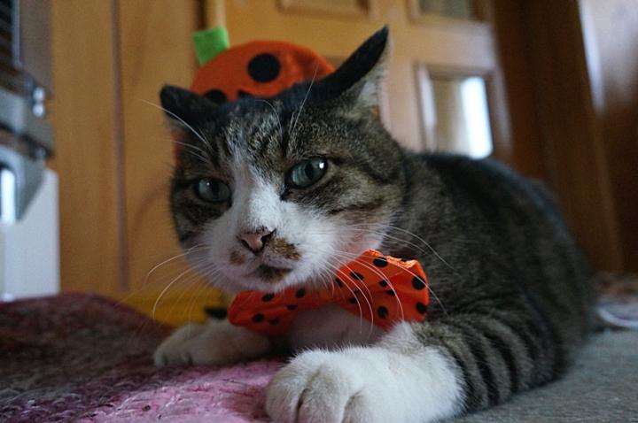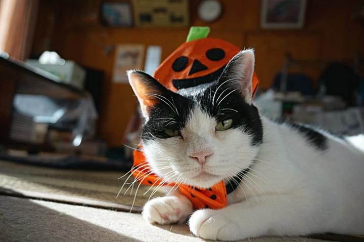 かぼちゃの被り物を着けられて…困惑&迷惑そう😓