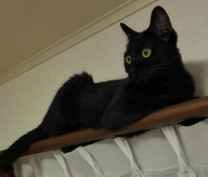 今日もカーテンレールの上で寛いでいます。