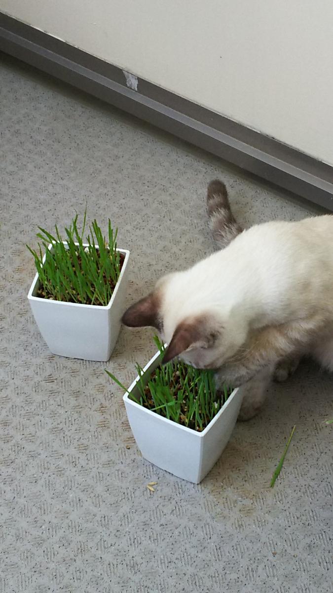 やっと生えた猫草、上手く噛めず手でチョイチョイしながら頑張って食べてました😻
