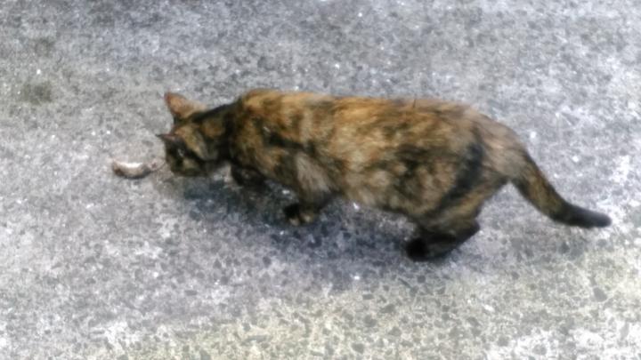 先日は猫からプレゼントがありました。玄関前の階段下に何か小さいものが見えたので、何かなと顔を近づけて見たところ、ネズミの死体でした。思わず「ギャー」って叫んでしまいました。