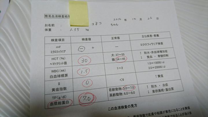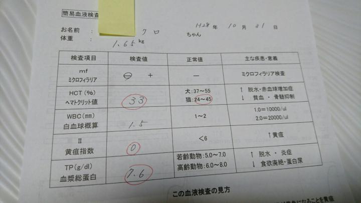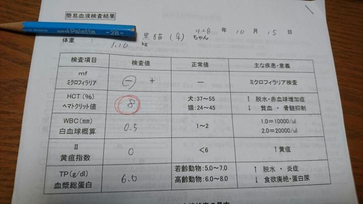 車の下にのせてきた仔猫が歯茎真っ白で、腹水・胸水たくさんたまってた時の簡易血液検査の数値。