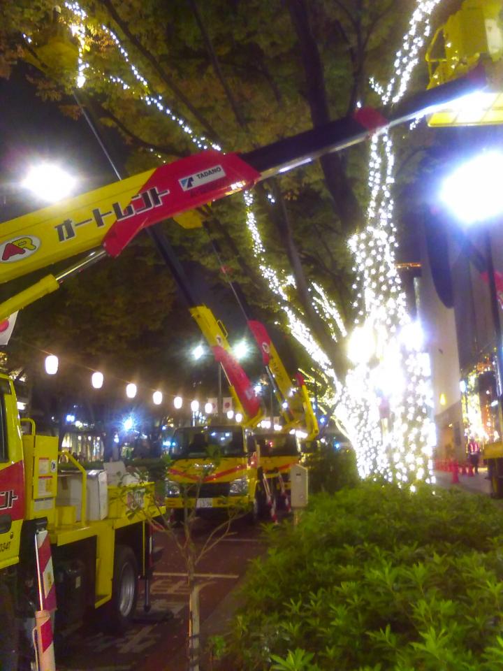 きりんさんが、街路樹にイルミネーションをデコっていました。