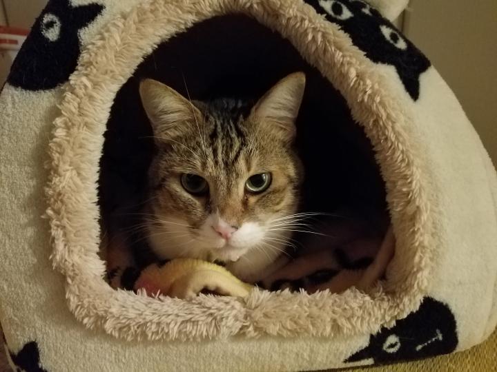 寝る前のサクちゃん、ネコマンジュウハウスに入ってじっとしてます。