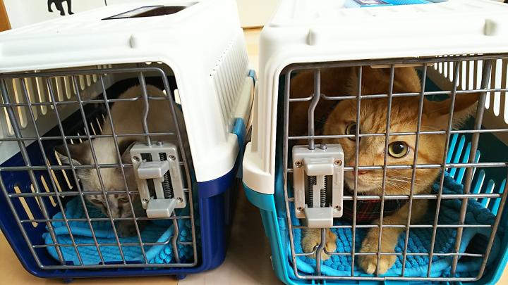 車中&病院、レンはずっと鳴きっぱなし、しまちゃんは落ち着いてました。やっぱレンはビビりですわ😅