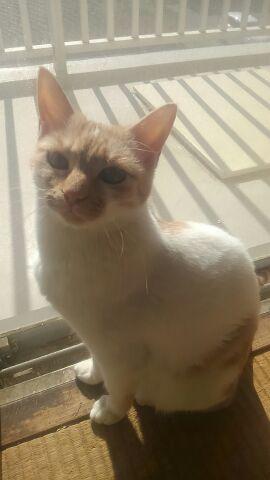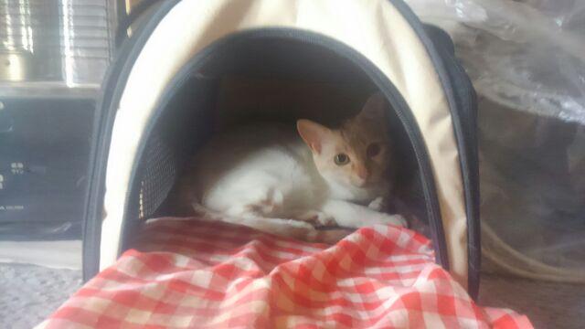 日中は陽だまりで丸くなっています。 曇りや雨の日は、自分からキャリーバッグに入っています。