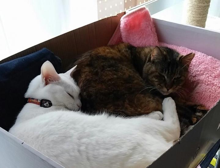 基本的にお互いあまり干渉しない我が家のお嬢さん方(世唯(サビ)・胡兎(白))ですが、冬の寒さにはこたえたようで初めてくっついてのんびりしているのを見て感動しました💕