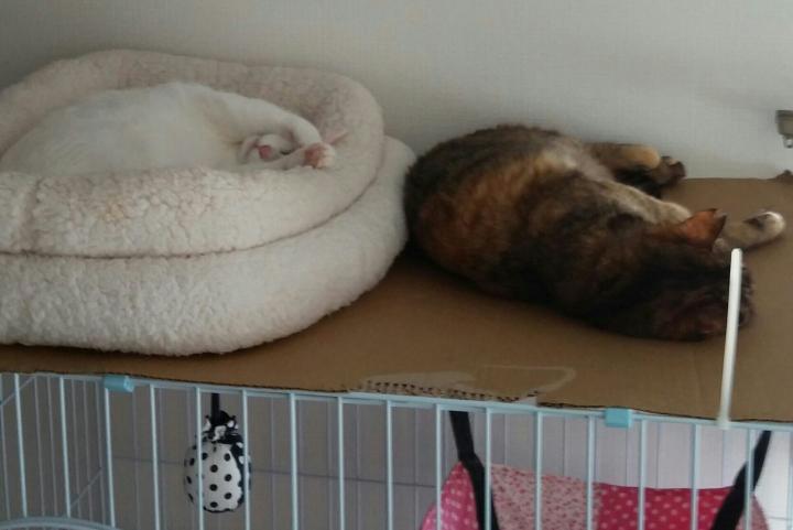 気温が上がってくると、やはり距離を保ちつつケージの上でスヤスヤ。