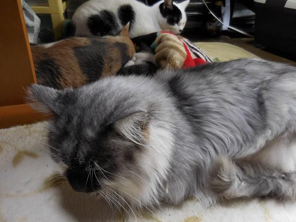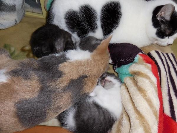 残された二匹の猫ちゃんに、お産経験のない代理母が寄り添ってます