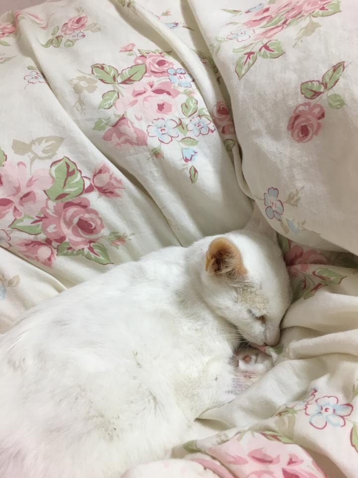 お昼頃、息遣いが荒くなり、弱々しくなっていました。ベッドに連れて行き、添い寝しながら歌を歌うとフミフミしようと頑張っていました。少し眠りました。私も寝不足だったので、うたた寝してしまいました。起きるとスフィンクスのように座っていて、表情もよくなっていました。