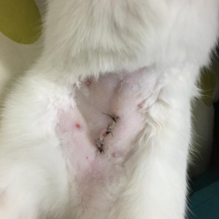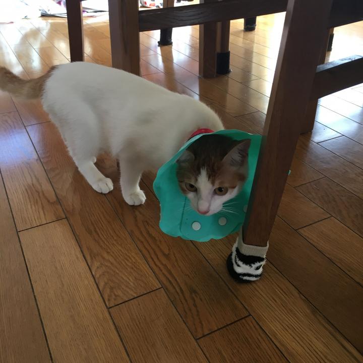 カラーは病院の先生から、傷口を舐めないように外さないようにと言われているので、1週間外せません。