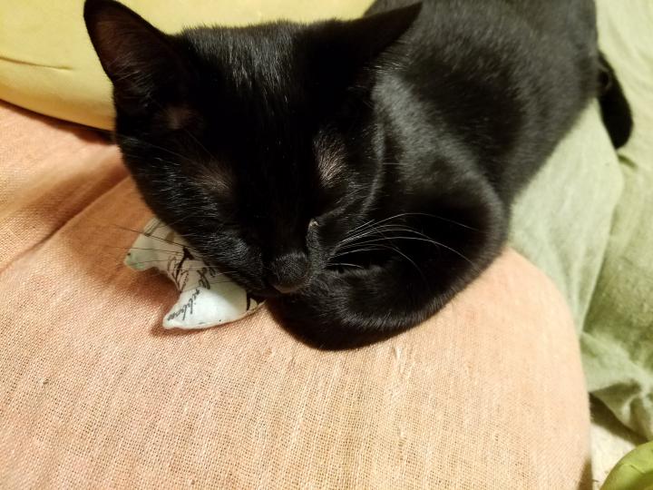 にゃきびしで遊び過ぎて疲れたら、にゃきびしを枕に寝ちゃいました~😪💤💤