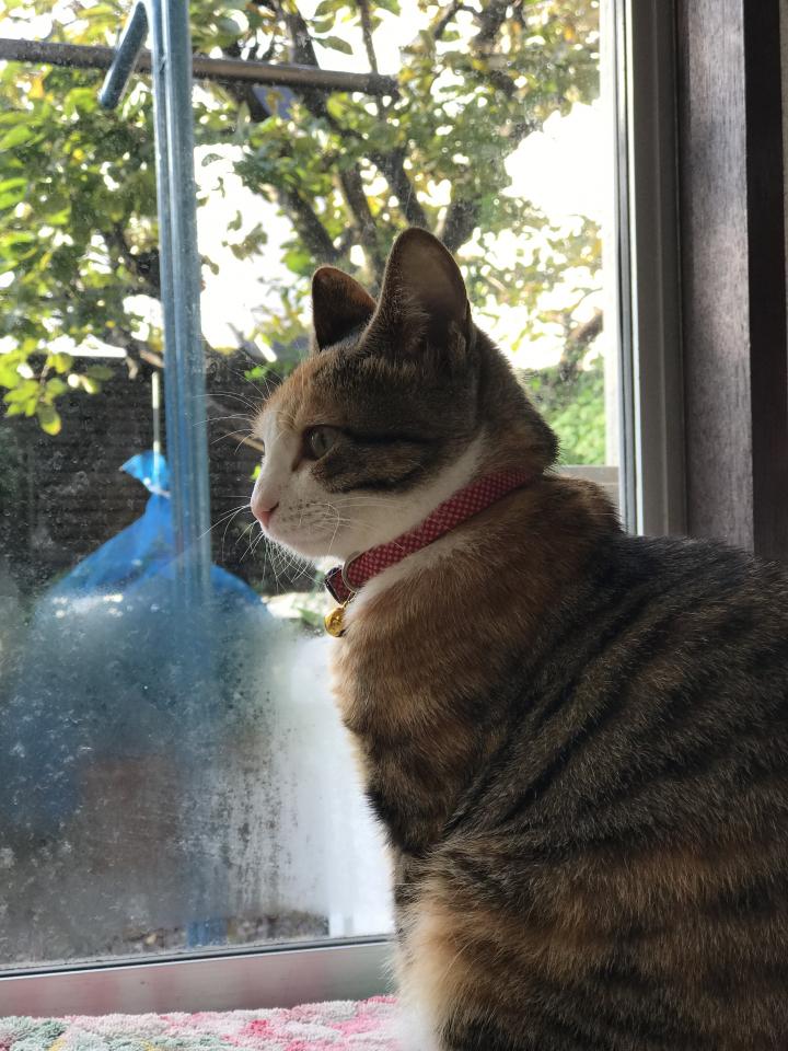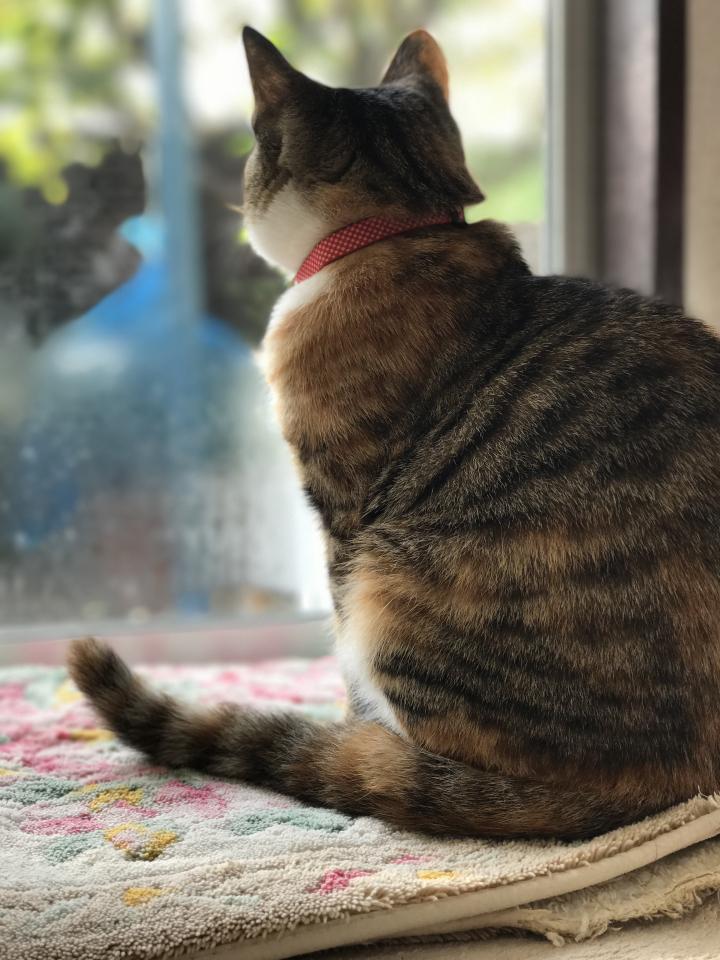 庭に来るピーちゃん(鳥)を、シッポの先パタパタさせて待っています