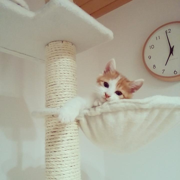 登山家の彼はおニューのキャットタワーのハンモックに先住猫より先に登頂を果たすという輝かしい経歴の持ち主。