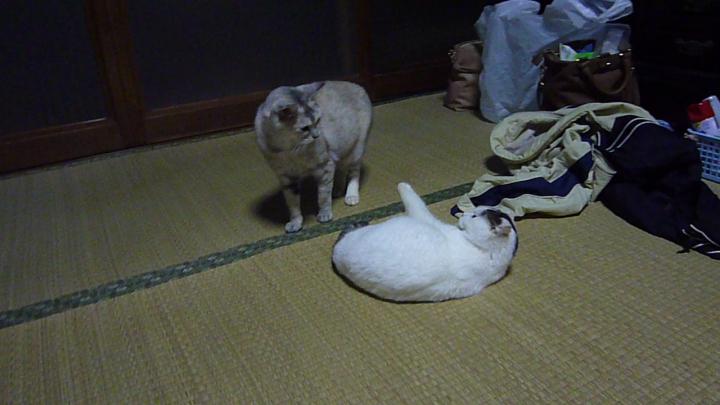 実家の飼い猫(まめ)と保護猫(シロ)は程よい距離を感じながらも
