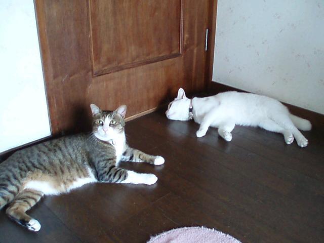 僕達時々こうして入り口に横たわり、ゲンさんがお部屋から出られないようにバリケードするんだよ。