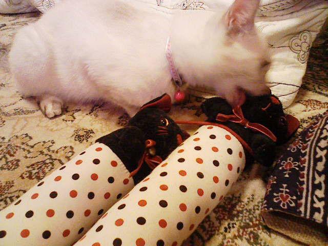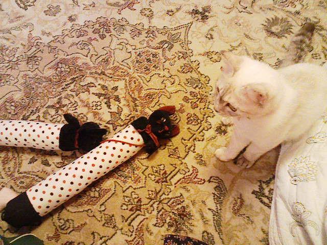 棒状のブーツキーパーの上にクロ猫のぬいぐるみがついてるやつ、玄関のブーツに差し込んであるが、玄関から私のいるリビングまで2本をつなげる紐をくわえて歩きにくそうに引きずってくる。