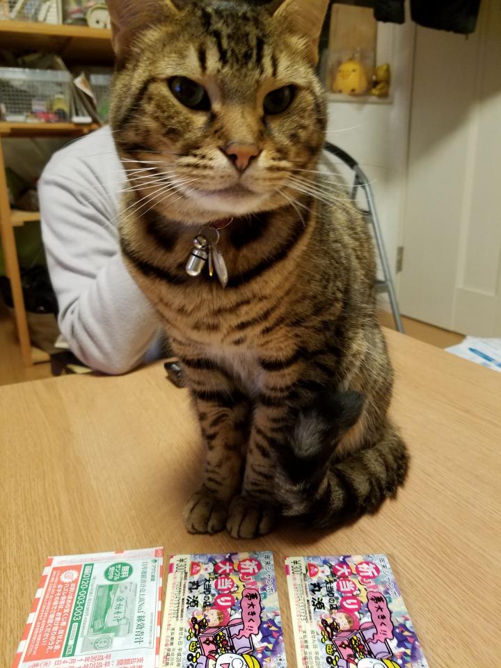 これで一等が当たったら、ニコちゃんには1ヶ月間ウマウマゴハン&おやつに焼きかつおっておとさんが言ってたぞ~😆