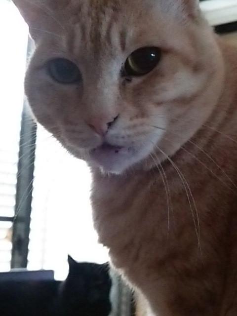目頭が切れた感じになっていて、写真の左目の目頭の黒いのは目ヤニではないんですよ。
