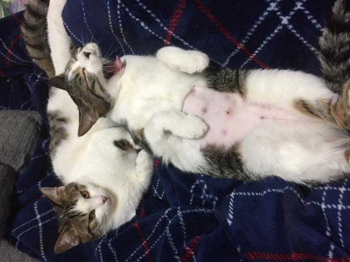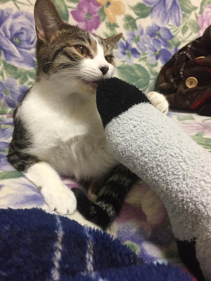 手術の痛みから解放されたミィちゃんは暴れん坊💦私のモコモコ靴下を噛んで離しません。