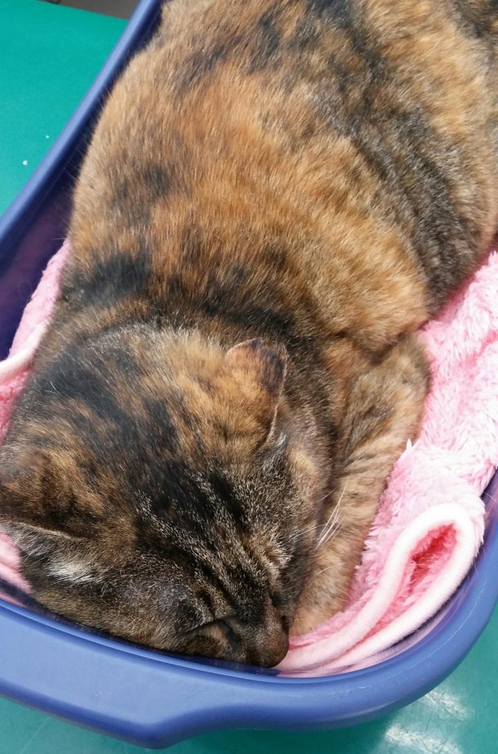 爪を切ってもらうのですが、抵抗して丸くなって足を隠しちゃうので獣医さんは『ハハハ(笑)相変わらずやなぁ〜』と笑いながら、なんなく切ってくださいます。