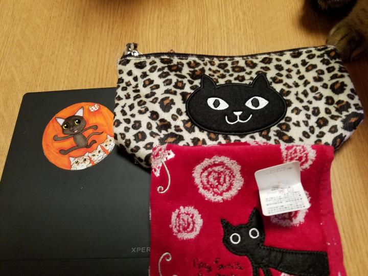 ネコマンジュウのポーチ(ニコ柄💖)と、ポンちゃん似の黒猫のハンドタオルです😊