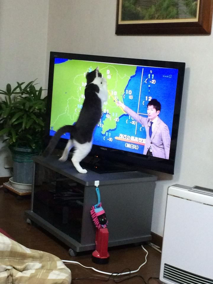 天気予報のおじさんの棒に一生懸命攻撃してます。