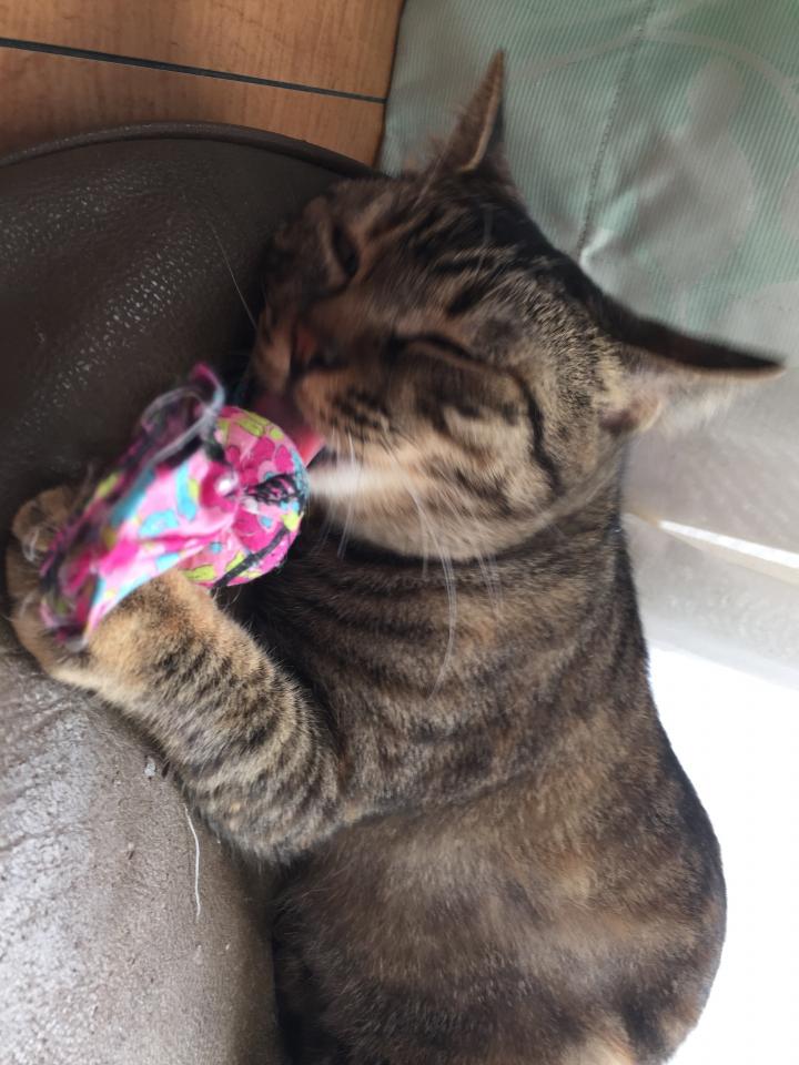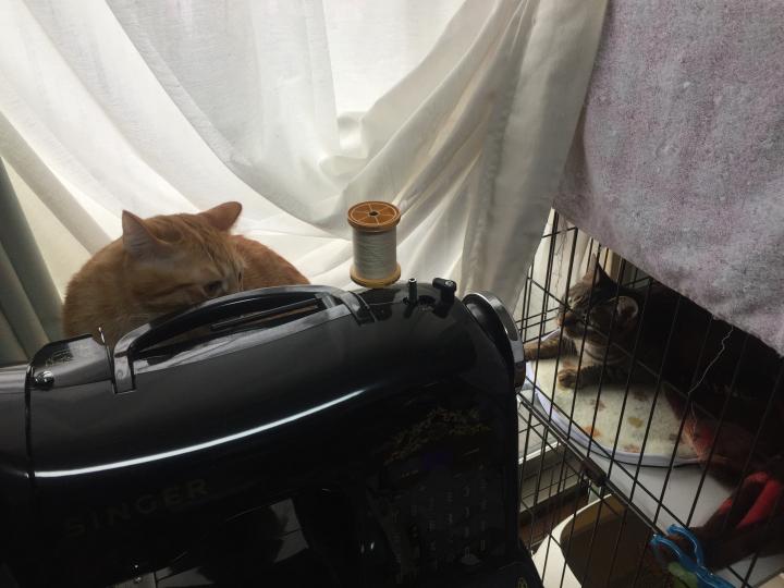 猫じゃらしを咥えて1人で遊ぶななこさんを、離れた場所にある桶ベッドの中で、ボーーーッと眺めてウトウトしているもちゃさん…
