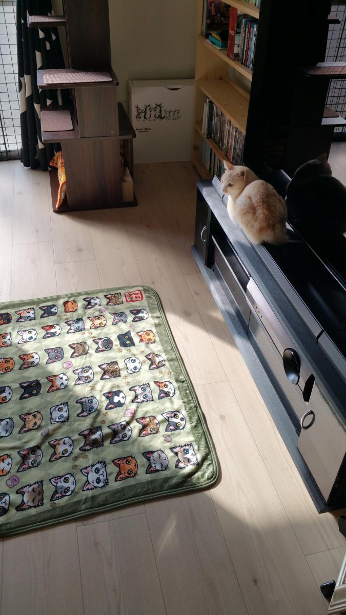おトイレに行ったスキに、床にブランケットを敷いてみました。