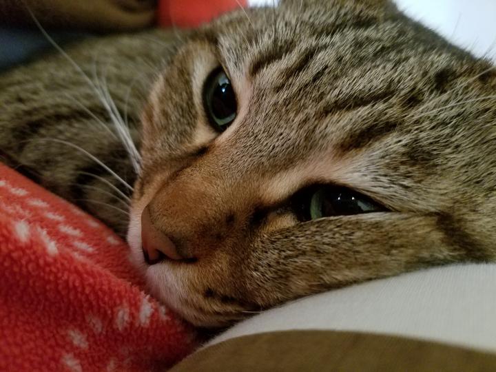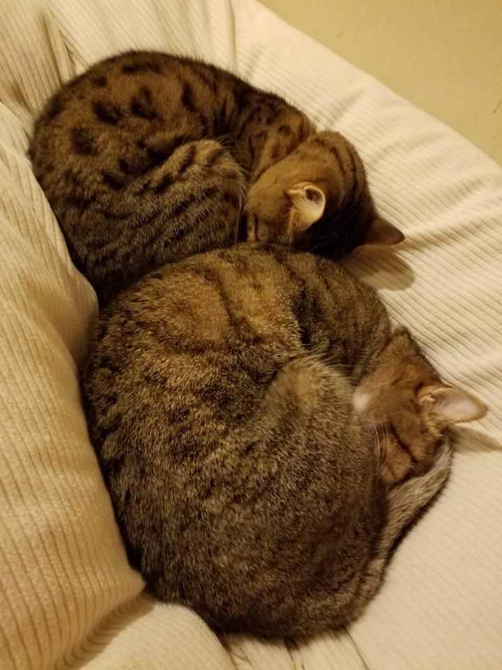 ワタシが羽毛布団に入ってる間、ポンちゃんはカリタの方にもダンナさんの方にも行かず、ドレッサー上の猫ベッドにずーっといました。