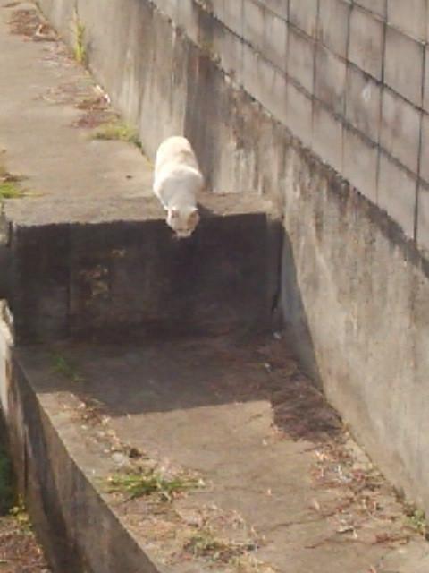 水路沿いに白くてスキップしながら走ってくる生き物の姿が・・。