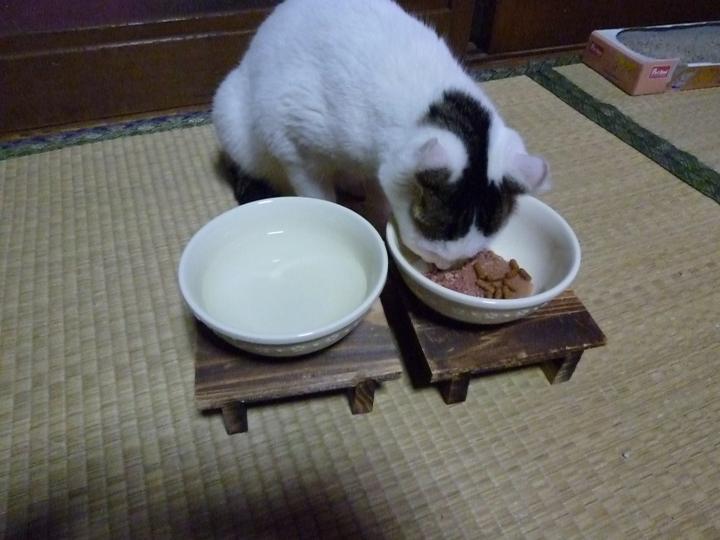 いつもはケージの中で食べているんですが、今夜はみんなのいる居間で食べさせました。