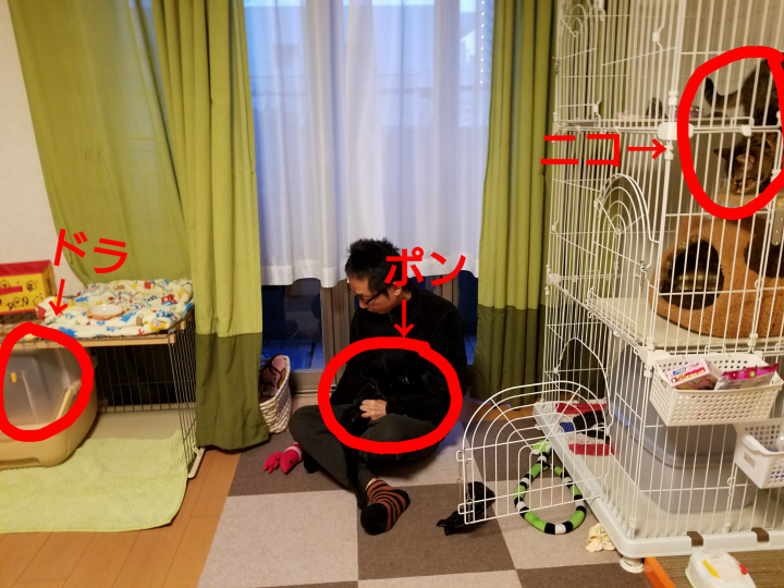 あやしいと思われた箇所はケージの2階(猫ハウス)とカーテンで隠れたカゴだと思いますが、カゴには誰もおらず、中にブランケットがあるだけです。