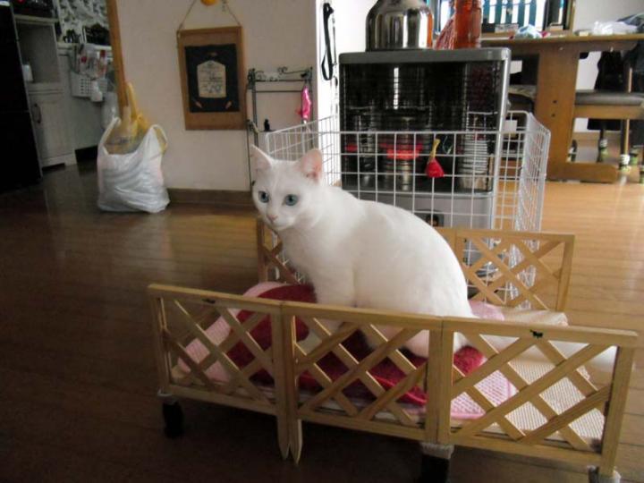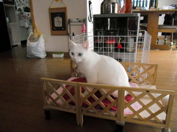 セナちゃんがストーブ前のセリアベッド上に居ますね。