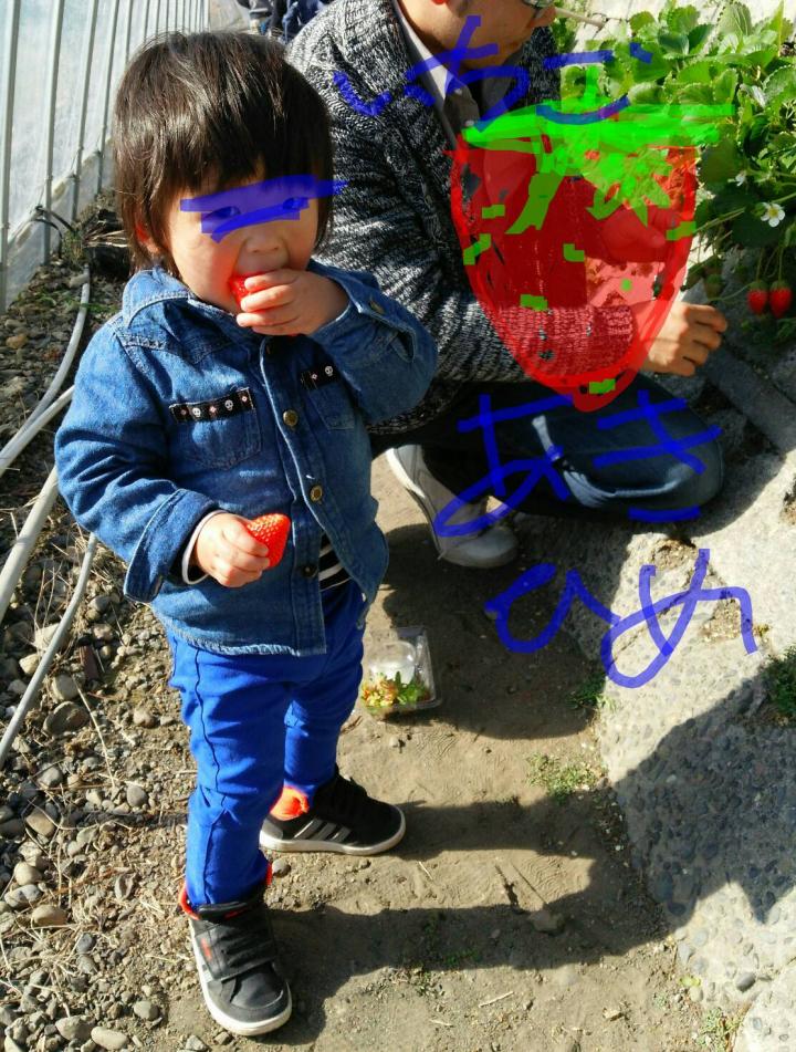 食べ物は片手では承知しない孫、大きな苺を両手にもって