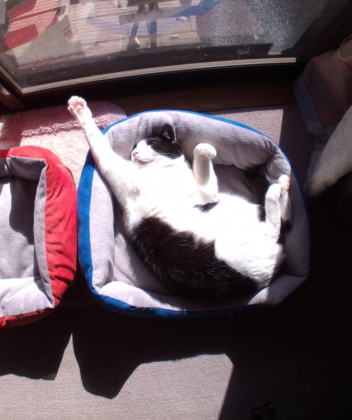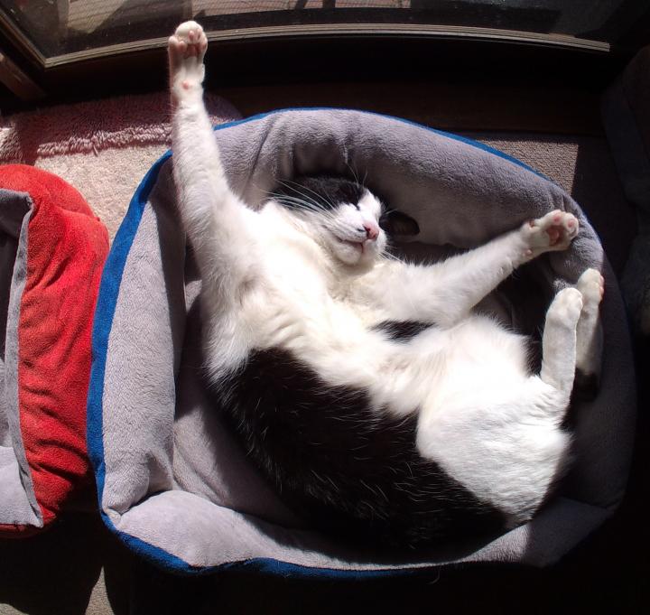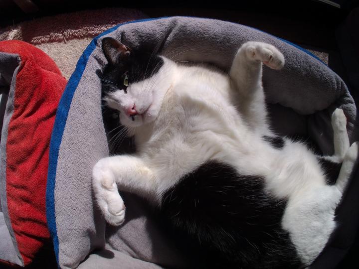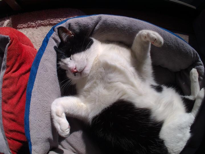 定位置のペットベッドに入って、ご機嫌のハチ君。