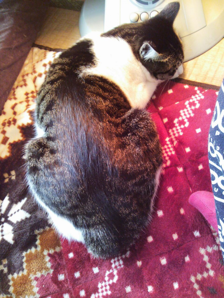 朝はまだ寒いのか?電気ストーブの前でストーブを枕にzzz・・・