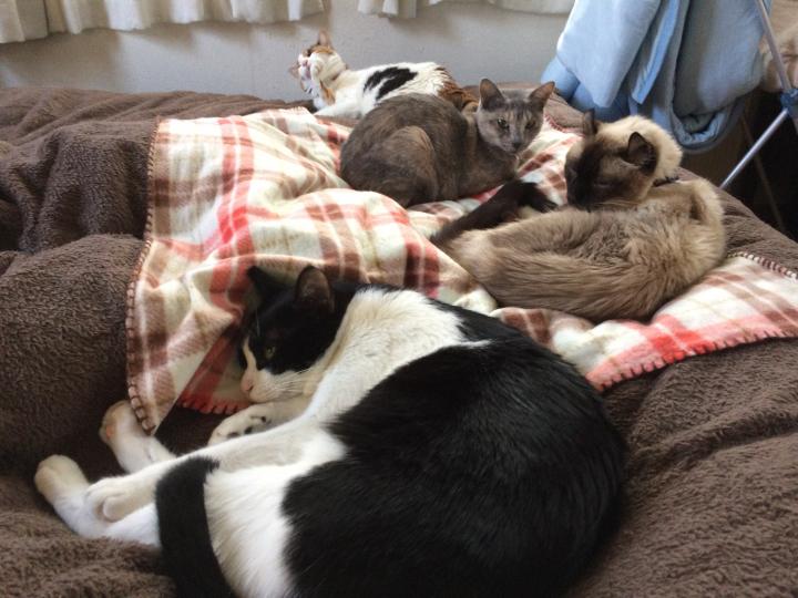 夜寝る時、布団の上にニャンズが集まってくるのはよくある光景。